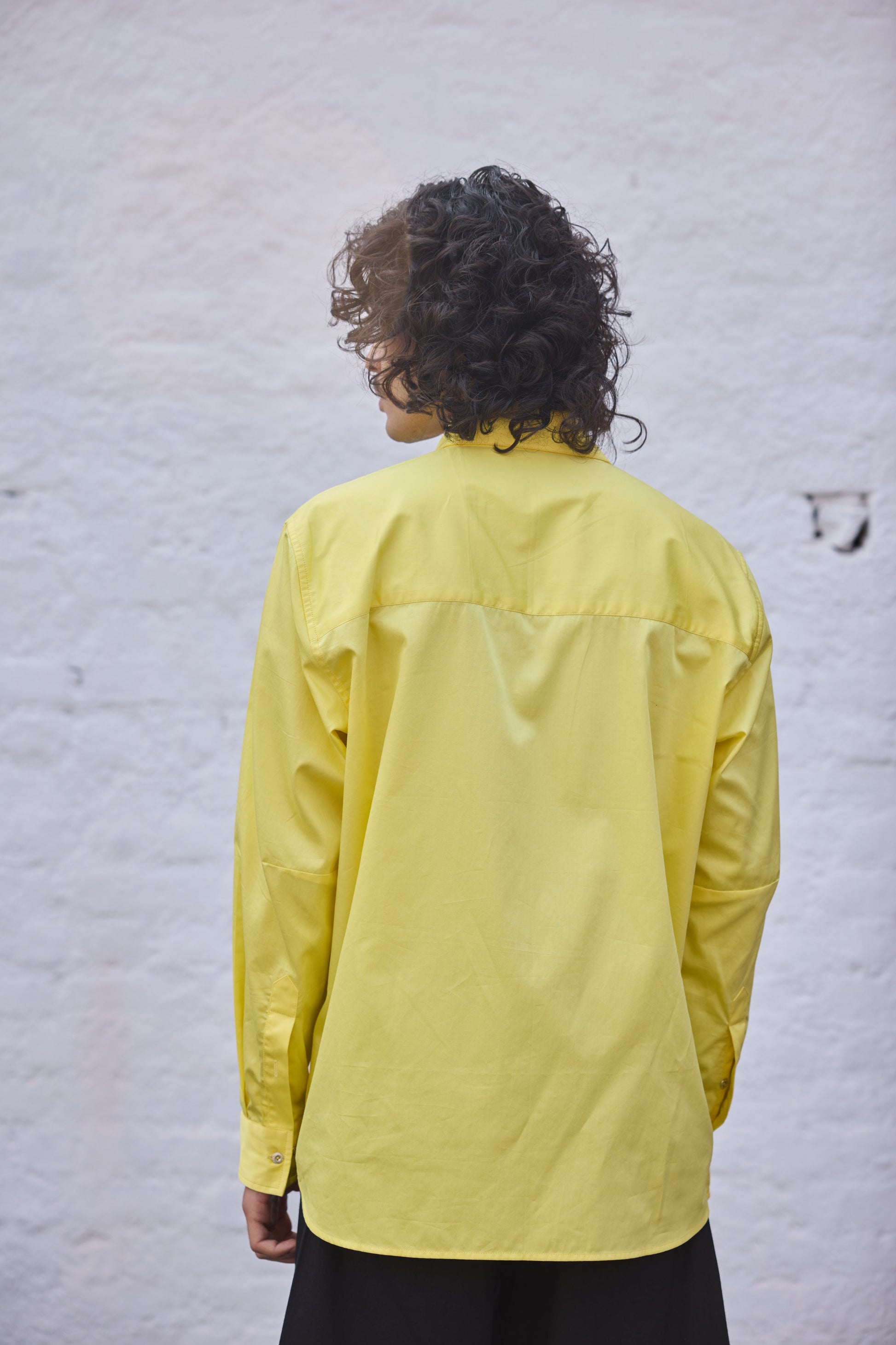 Cut from 100% Giza cotton, this shirt features an asymmetrical front closure and disproportionate collars, creating