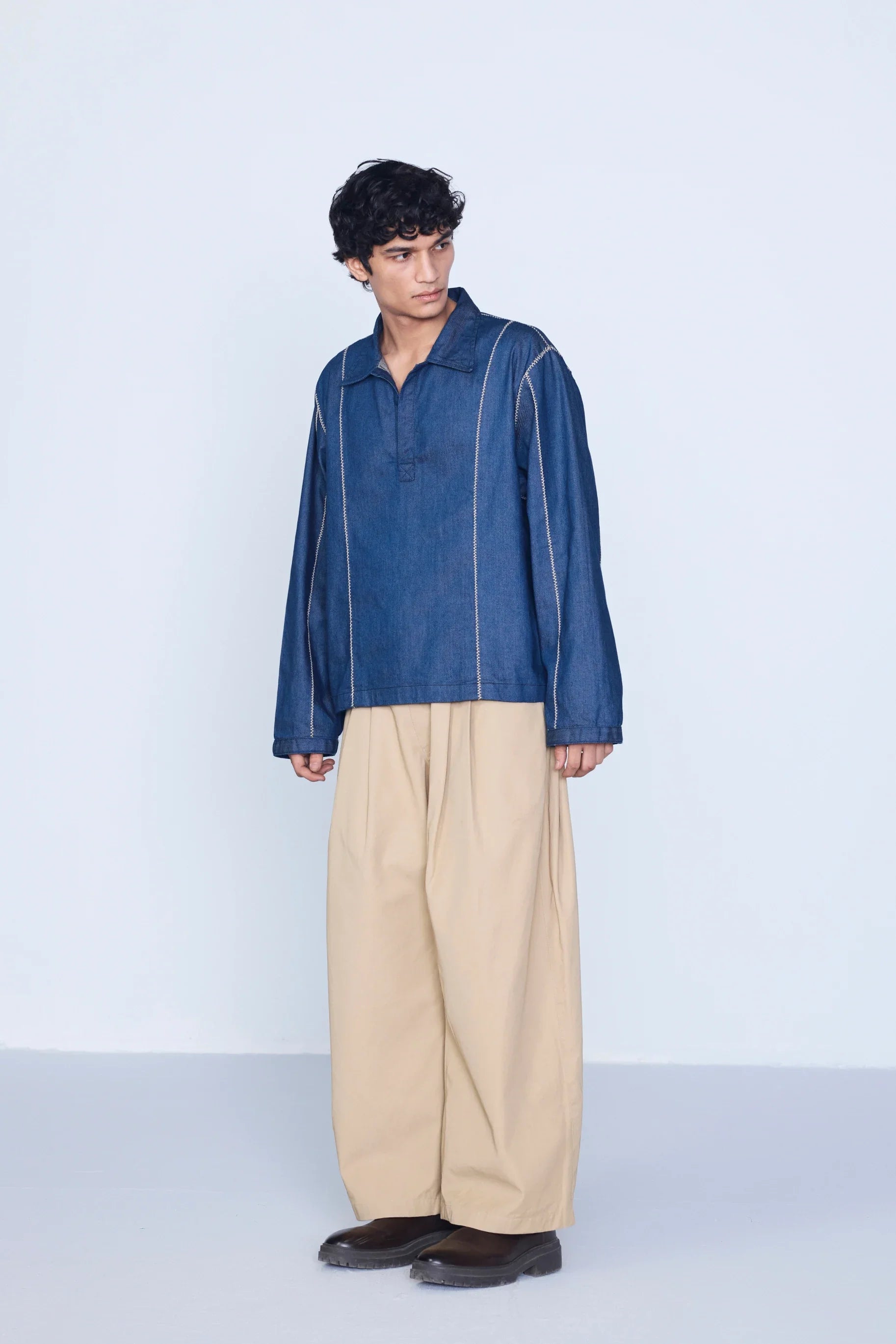Made from 100% cotton denim, this polo shirt features a blanket barb stitch for a durable finish. The back has a unique detail where surprise handloom is sandwiched stitched between the outer and inner layers, revealed only when pulled apart;carefully crafted with hands.