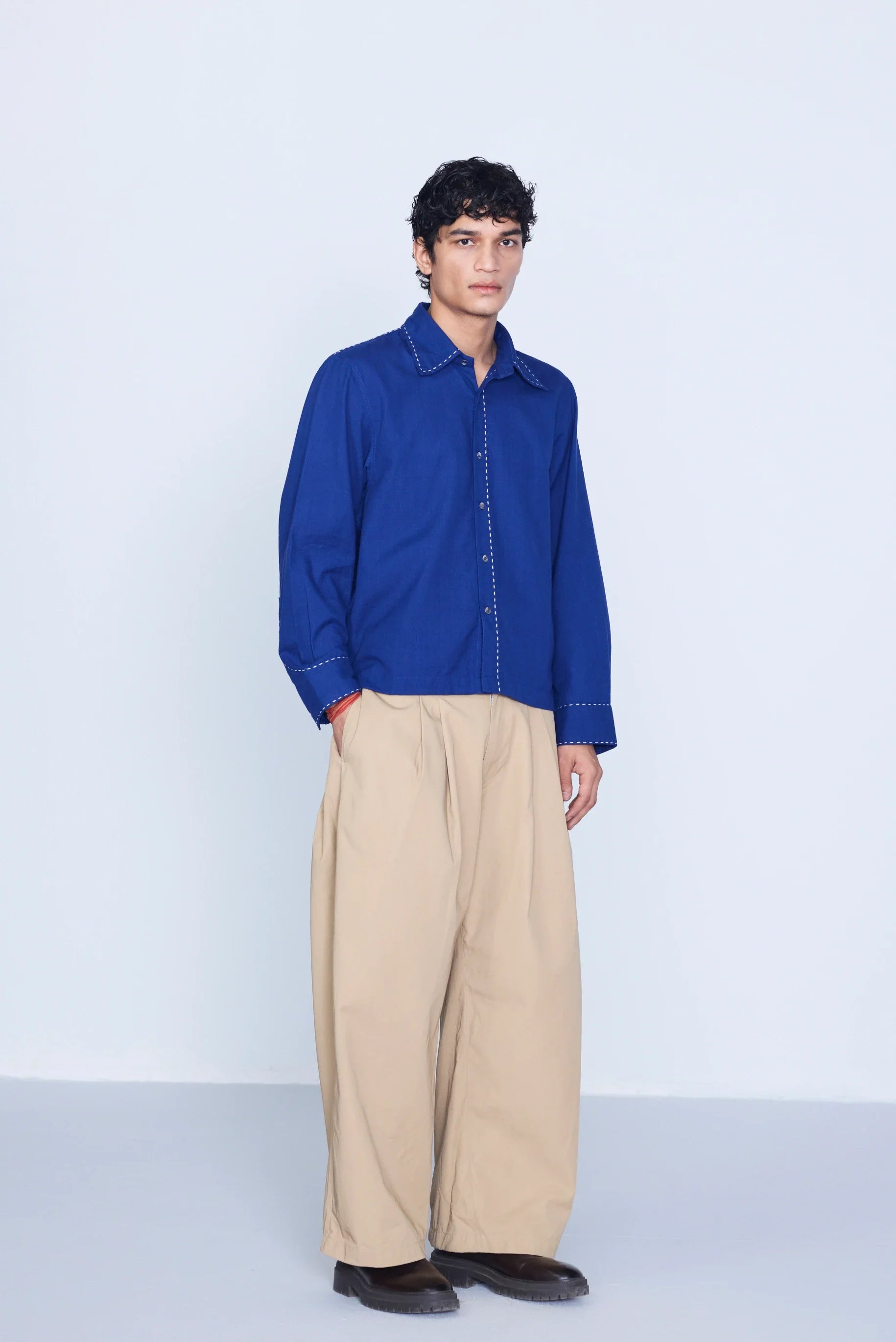 This breathable indigo handloom shirt features intricate Kantha embroidery on the cuffs, adding a subtle yet distinctive touch, perfect for everyday wear
