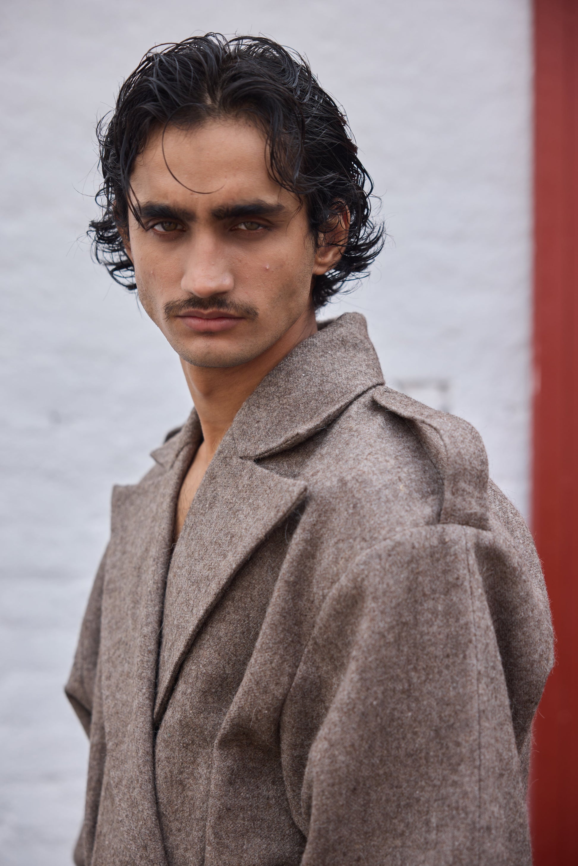 Designed with oversized lapels, a belted front closure, sleeve belt details, and two side pockets, the jacket features subtle